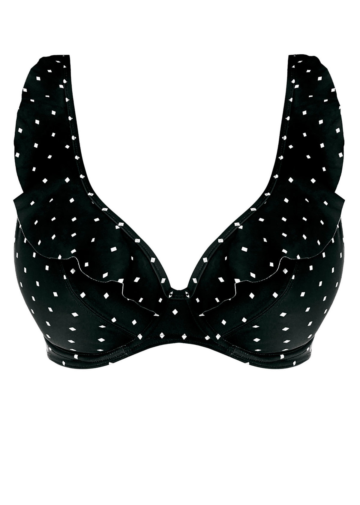 Märket Fantasie har alltid haft fantastiska baddräkter, här i en vacker modell med diskret print som passar året om. Hemligheten för den fina formen är mjuka byglar som lyfter bysten samt stödnät på insidan som hjälper till ytterligare. Snörningen nertill gör att du kan variera längden lite vilket är perfekt om den sitter awesome upptill men "släpper" lite på rumpan. Häftigt med en baddräkt som finns upp till M-kupa!